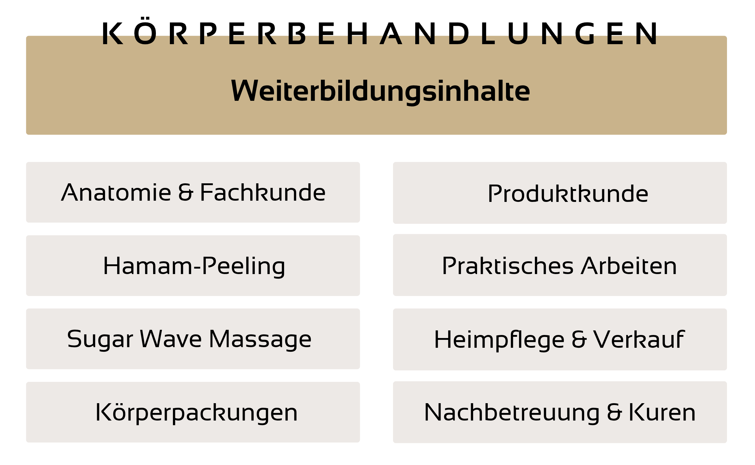 Im Fokus stehen drei zentrale Methoden: das Hamam-Peeling zur intensiven Hauterneuerung, die Sugar Wave Massage zur Aktivierung von Gewebe und Lymphfluss sowie Körperpackungen zur Pflege und Regeneration. Du erarbeitest die Behandlungsabläufe Schritt für Schritt und trainierst die Anwendungen praxisnah, um sie sicher in deinen Studioalltag zu integrieren.